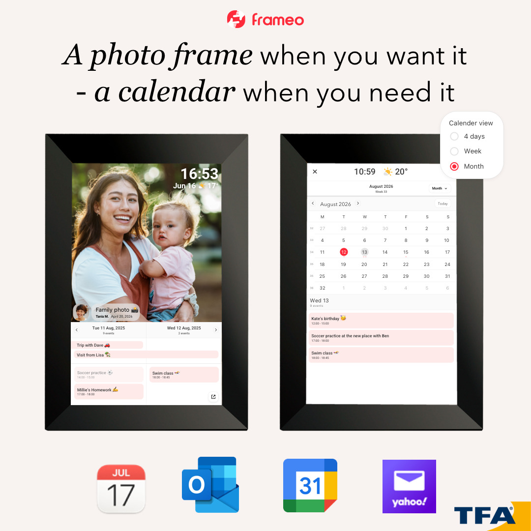 What‘s new is the practical calendar feature for the whole family. Now you can view photos on the frame while easily tracking upcoming events. Simply switch to the calendar view or the hybrid layout with photo and daily calendar. The schedule is automatically synchronized with the digital calendars you already use.