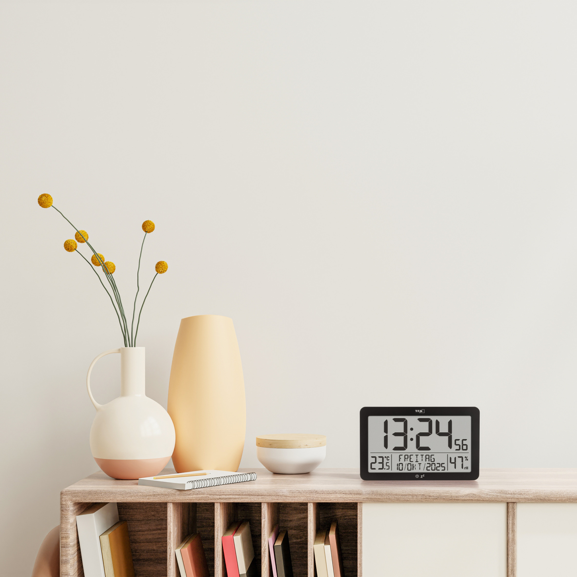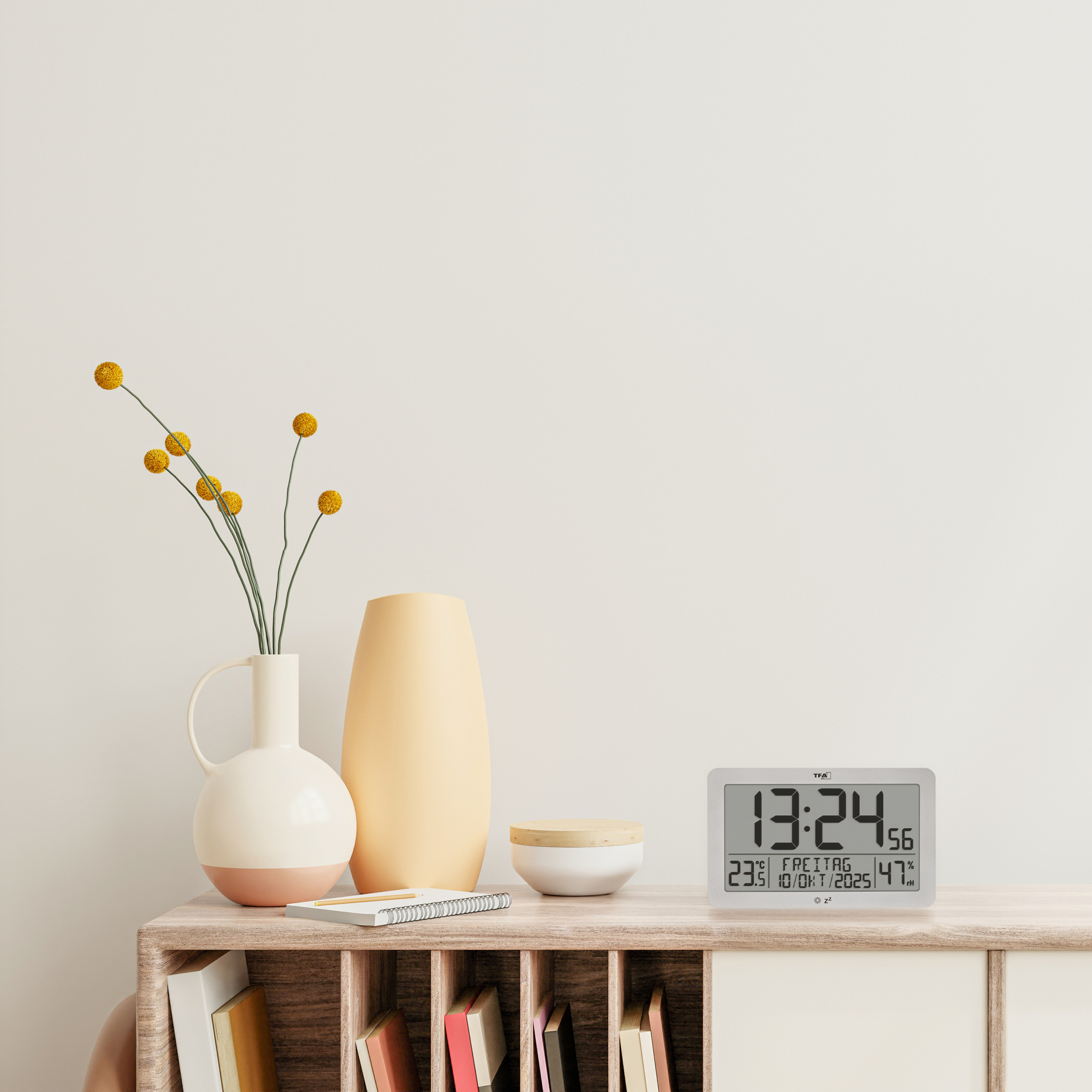 Neben dem Datum mit dem voll ausgeschriebenen Wochentag in sechs Sprachen werden zudem Innentemperatur und Luftfeuchtigkeit angezeigt. So haben Sie das aktuelle Raumklima immer im Blick und können durch gezieltes Heizen und Lüften für eine Wohlfühlatmosphäre sorgen.