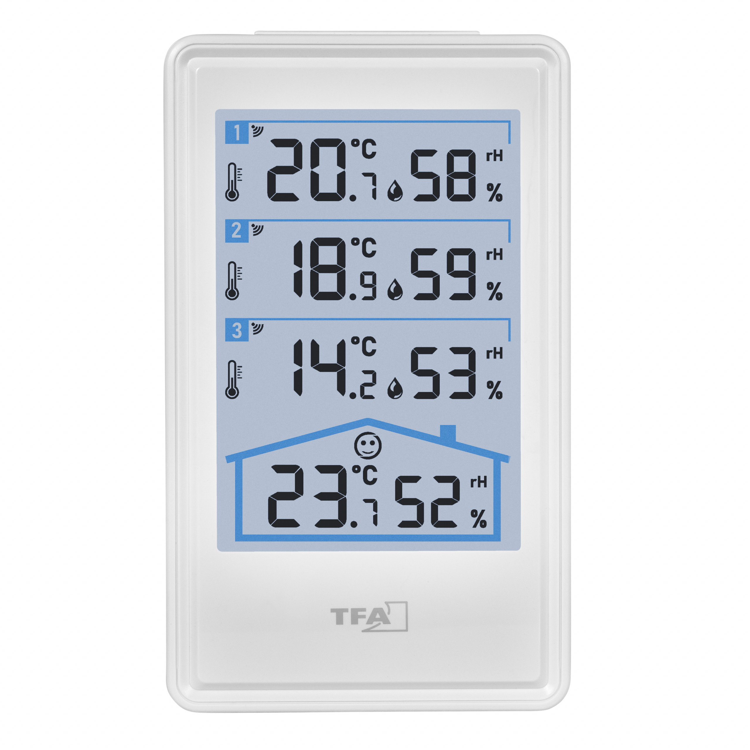 - Kabellose Übertragung der Außentemperatur und Luftfeuchtigkeit über 3 Sender (max.100m)